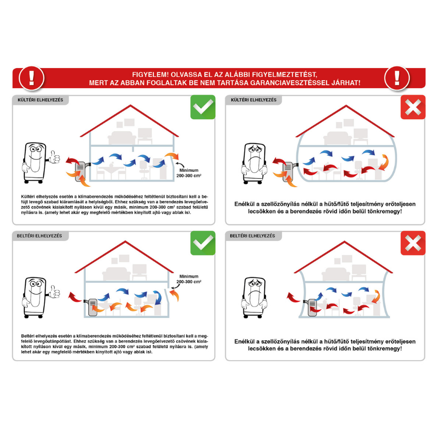 Ha a mobil klímát egycsöves kivitelben -ahogy alapvetően kapható - a hűtendő helyiségben kívánja elhelyezni, a csövön a működés közben termelődő meleg levegőt szükséges kivezetni a szabadba.